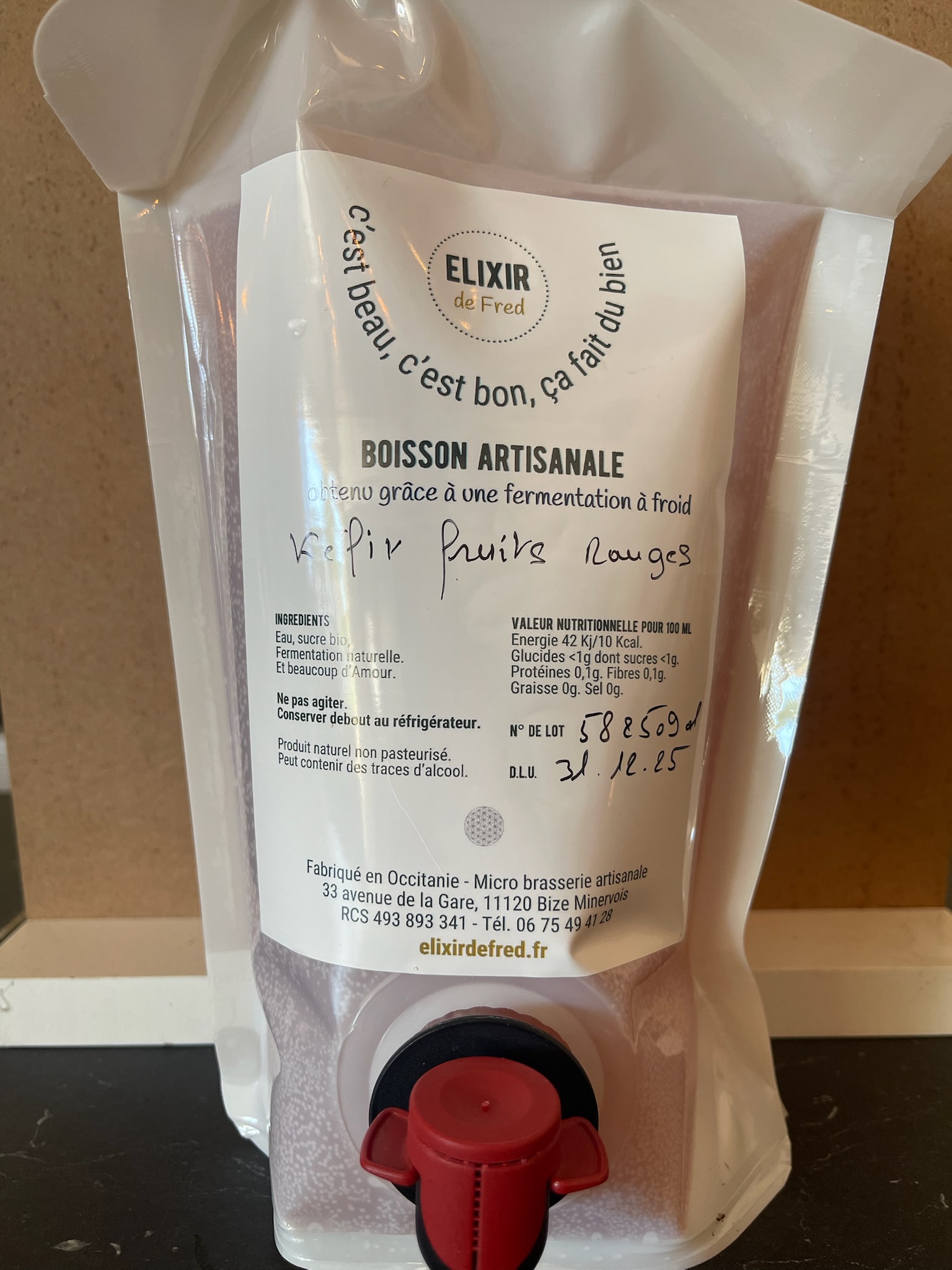 • Eau pure, sucre bio, zestes de rose musquée bio, pomme bio, hibiscus bio, fraises bio, cassis bio, framboises bio, groseilles bio, orange bio, grains de kéfir.